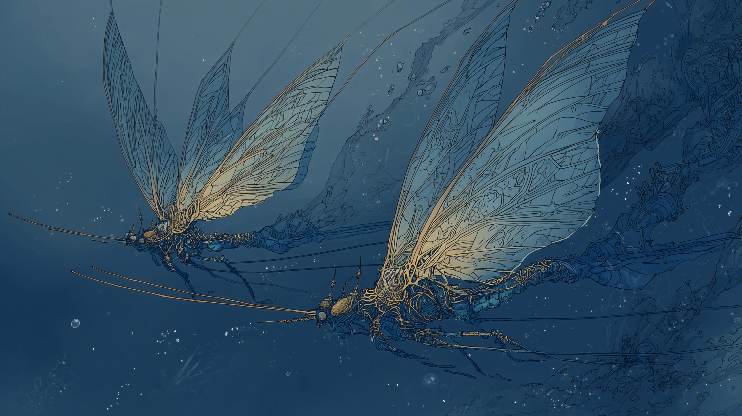 #6 – Le voyage : fort de ses expériences précédentes l’Aigland va pouvoir entamer la période la plus marquante de son existence, celle vers laquelle tend toute son existence. Il va déployer ses ailes et cela au sens littéral du terme. Cette métamorphose, qui n’est pas encore la mue elle-même, doit lui permettre de s’envoler, de sortir de l’atmosphère de Caza – leur planète natale – et de rejoindre l’espace. C’est là qu’ils s’enkystent pour leur dernière transformation. Au sortir de la chrysalide, ils deviennent ces êtres que nous connaissons si bien maintenant et qui ne manque jamais de nous émerveiller, ces géants parés d’ailes diaphanes, d’organes pareils à des oreilles radars surdéveloppés, d’une longue queue annelée dépassant souvent les trente mètres et de ces huit pattes insectoïdes si fines que l’on craint qu’elles ne se brisent rien qu’en les observant.